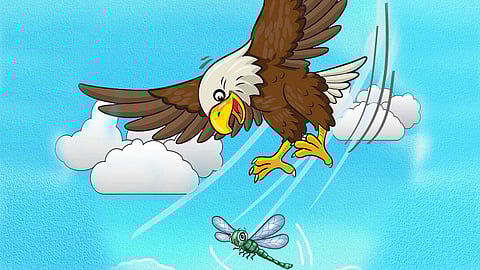 He turned his head ever so slightly to look at the dragonfly better. From where had it appeared? Look at its two huge eyes – insects have compound eyes, Hilda Ma’am was saying. Was it listening to Hilda Ma’am talking about its cousins? Ah, how wonderful it would be to just hover up and down! Even as this thought came to him, he heard a buzzing sound and found himself on an escalator climbing up towards a pair of shimmery wings.
