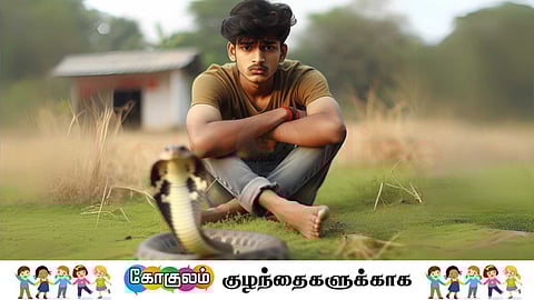 "என்ன கந்தா பார்க்குறே! நான் யாரென்று உனக்குத் தெரியவில்லையா? கொஞ்சம் குனிந்து உன் காலருகில் பார்!" என்ற குரலைக் கேட்டு சற்றுப் பயத்துடனேயே கந்தன் கீழே குனிந்து தன் காலடியைப் பார்த்தான். அங்கே பாம்பு ஒன்று தன்னைச் சுற்றிக்கொண்டு ஒரு கற்பாறை போன்று கிடந்தது.