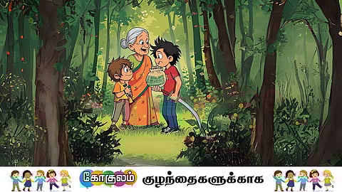 அருணனும் வருணனும் புறப்படும் முன் பாட்டியின் காலில் விழுந்து வணங்கினார்கள். கட்டி அணைத்த பாட்டி, “இந்தாங்க, இதைப் பத்திரமா வச்சுக்கோங்க “ என்று சொல்லி ஒரு சுருக்குப் பையையும் ஒரு சிறு மூட்டையையும் கொடுத்தாள்.