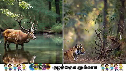தண்ணீர் குடிப்பதற்காக கீழே குனிந்த மான் தண்ணீரில் பிரதிபலிக்கும் தன்னுடைய பிம்பம் முழுவதையும் பார்த்து மிகவும் ஆச்சரியப்பட்டது. "ஆஹா, நான் எவ்வளவு அழகாக இருக்கிறேனே! என்னுடைய கொம்புகள் எவ்வளவு அழகாக வலிமையாக இருக்கின்றன, என்னுடைய உடல் எவ்வளவு அழகாக இருக்கிறது!" என்று தன்னுடைய உடலின் ஒவ்வொரு பாகத்தையும் தண்ணீரில் தெரியும் பிம்பத்தை பார்த்து ரசித்துக் கொண்டே வந்தது.