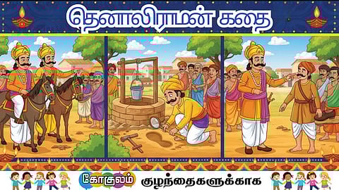 தெனாலிராமன் அங்கு சென்று விசாரித்தபோது, "இங்கு நீர் இறைக்கும் வாளி அடிக்கடி காணாமல் போகிறது. புது வாளி வாங்கி வைத்தாலும் திருடிவிட்டுப் போய்விடுகிறார்கள்," என்று அங்கிருந்தவர்கள் சொன்னார்கள்.