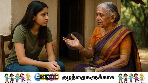 "சூப்பர் பாட்டி! ரொம்ப தாங்ஸ். மூட நம்பிக்கைக்கு பின்புறம், இப்படி நிறைய ஸயன்டிஃபிக் (Scientific) காரணங்கள் இருப்பது இப்போது புரிந்தது. Beautiful ஆ சொன்னீங்க. ஊருக்கு போனப்புறம், இந்த மூட நம்பிக்கை... இல்ல இல்ல இந்த நம்பிக்கைகளுக்குப் பின்னால் இருக்குற ஸயன்டிஃபிக் Reasons பற்றி ஒரு Awareness Essay (விழிப்புணர்வு கட்டுரை) எழுதி உங்களுக்கு க்ரெடிட் கொடுப்பேன் பாட்டி," என்ற அனைஷா, காமாட்சி பாட்டியைக் கட்டி அணைத்து கன்னத்தில் "நச்" என முத்தமிட்டாள்.