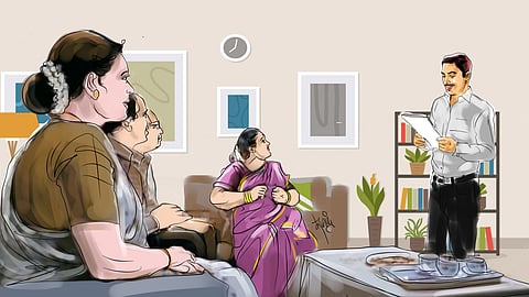 “அப்பாவோட முதல் வருஷ திதி காரியமெல்லாம் நேத்திக்கு முடிஞ்சது. அதுக்கு அடுத்த நாள் அதாவது இன்னிக்கு அப்பா எழுதி வெச்ச உயிலை ஆடிட்டர் முன்னிலையில் லாயர் படிக்கப் போறார். இப்ப இருக்கிற சொத்து பூராவும் அப்பா தன்னோட சுய சம்பாத்தியத்துல சம்பாதிச்ச சொத்து. உயிலை அவர் எப்படி எழுதி வெச்சிருப்பாரோன்னு எங்களுக்கெல்லாம் மனசு பூராவும் ‘திக் திக்’ன்னு இருக்கு… ஆனா நீ மட்டும் அலட்டிக்காமே நிம்மதியா சோபாவுக்கு சாய்ஞ்சு உட்கார்ந்துட்டு டி.வி பார்த்துட்டிருக்கே?”