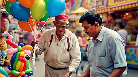 அந்த சமயத்தில் ஒரு பலூன்காரன் வழக்கம் போல பலூனைத் தேய்த்து ஓசையை எழுப்பிக் கொண்டே வந்தான். அதைப் பார்த்த மானேஜரின் பேரப் பையன் தனக்கு பலூன் வேண்டுமென தன் தாத்தாவிடம் கேட்டான்.
