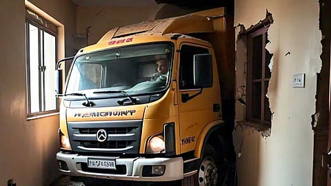 லாரியின் மோதலால், வீட்டின் முன் பகுதி இடிந்து போயிருந்தது.