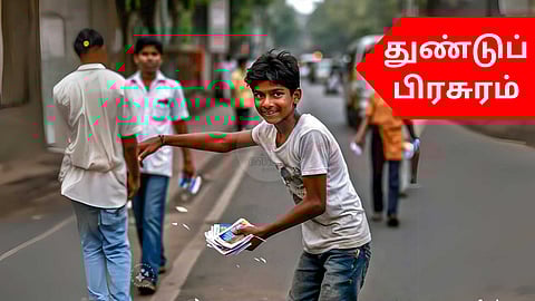 அதாவது அவர் யாராவது சிலரை இதுபோல துண்டு விளம்பரப் பிரசுரங்களை விநியோகிக்க நியமித்திருந்திருப்பார். அந்தப் பொறுப்பை மேற்கொண்டவர்கள், ஏதோ வேலையை முடிக்க வேண்டும் என்ற அவசரத்தில், தன்னிடம் இருக்கக்கூடிய துண்டு பிரசுரங்கள் எல்லாவற்றையும் விநியோகித்து விட்டதாகக் கணக்குக் காட்டுவதற்கு எடுத்துக்கொண்ட எளிய வழிமுறைதான் இது என்று எனக்குப் பட்டது. ஒவ்வொருவருக்காகக் கொடுத்துக் கொண்டே வந்தால், அநேகமாக மாலைவரை தன்னிடமுள்ள ஆயிரக்கணக்கான துண்டுப் பிரசுரங்களை அவர் விநியோகிக்க வேண்டியிருக்கும். அதைவிட, கொத்து கொத்தாக ஒரு சில தெருக்களில் ஒருசில வீடுகளில் வீசி எறிந்து விட்டு, எடுத்துக் கொண்ட வேலையை ஒருமாதிரியாக முடிந்துவிட்ட திருப்தியில் கைகளைத் தட்டிக் கொண்டு அவர் போயிருப்பார்.