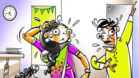ஓ... தன் கணவரும் அவர் மேலதிகாரியும் வந்து விட்டனர் என்பதைப் புரிந்துகொண்டவள் குமாரை ஒரு அறைக்குப் போகச்சொல்லி கதவை தாளிட்டவள், கதவைத் திறந்து தன் கணவரையும் அவர் மேலதிகாரி மற்றும் அவர் மனைவியை வரவேற்றாள். சிறிது நேர அறிமுகச் சந்திப்புக்குப் பின் டிபனை எடுத்து வரும்படி கணவர் அறிவுறுத்தவே அவள் டிபன் எடுத்து வந்தாள்.