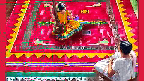அம்மாவின் கைவிரல் தன்னையுமறியாமல், ஒரு பச்சைக்கிளியை மெல்ல வருடியது. அவள் கண்களில் ஆனந்தபாஷ்பம்! என்றென்றும் அந்தத் தங்கநிறப்பட்டு ஜமக்காளம் தம்புராவிற்கு இணைபிரியாத துணையாகிவிட்டது.
