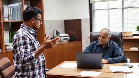 ஏதோ கணக்கு சரிபார்த்துக் கொண்டிருந்தவர் நிமிர்ந்து பார்த்தார்... பார்வையில் ‘என்ன..?’