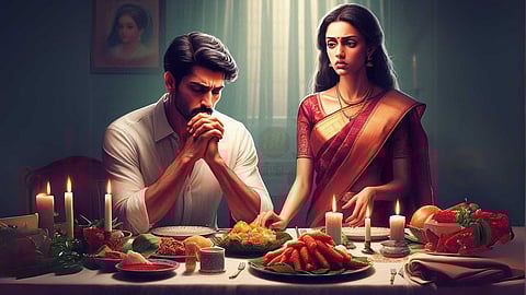 டைனிங் டேபிளில் மகேஷீக்காக காத்திருந்த மாலா, "மீட்டீங் லேட்டாயிடுச்சு போல! பசிக்குது சாப்பிட வாங்க!" என்றாள். ஃப்ரெஷ் ஆகி உடை மாற்றி சாப்பிட அமர்ந்தவன் ஒன்றும் பேசாமல், பேருக்கு சாப்பிட்டு முடிக்கையில்,