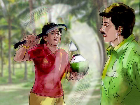ஒரு காலை மடக்கி தென்னையின் மேலும், மற்றொரு காலை தரையில் ஊன்றியும், தென்னை மரத்தின் மேல் சாய்வாக நின்றிருந்த அவள் முகத்தின் மீது லேசான பகல் வெயில் படர்ந்திருந்ததது. தோப்பில் வியாபித்திருந்த அமைதியைக் கிழித்துக் கொண்டு அவளின் குரல் ஒலித்தது,