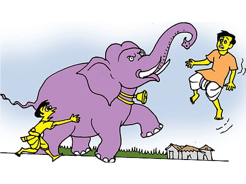 எதிரே பெரிய யானை ஒன்று வெறியோடு பிளிறிக் கொண்டு ஓடி வந்து கொண்டிருந்தது. அதனைத் துரத்திக்கொண்டு வந்த அதன் பாகன், சீடனை விலகிச் செல்லுமாறு பலமுறை கூக்குரலிட்டான். ஆனால் சீடனோ, 'நாராயணன் என்னைக் கைவிட மாட்டான்' என்று கூறி ஒதுங்காமல் நேர் எதிராக அப்படியே நின்று கொண்டிருந்தான். எதிரில் வந்து கொண்டிருந்த யானை, தன் துதிக்கையால் சீடனைத் தூக்கி, தூர வீசி எறிந்தது. பலத்த காயங்களோடு சீடன் உயிர் பிழைத்தான்.