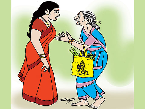 "போன வருஷம் செஞ்சுரி போட்டுட்டு இப்போ ப்ளஸ் ஒண்ணுல இருக்கா. ஆனாலுமென்ன ? வெளி நாடுகள்ல நூத்தி பத்து வயசோட மனுஷா இன்னும் தேக ஆரோக்யத்தோட இருக்காளாம். அந்த மாதிரி மங்களம் மாமி ஏன் இருக்கக்கூடாது. அதனாலதான் சொல்றேன். மறக்காமல் வேண்டிக்கோடி குழந்தே!" சொல்லிவிட்டு கோமளா மாமி திரும்பி நடந்தாள்.