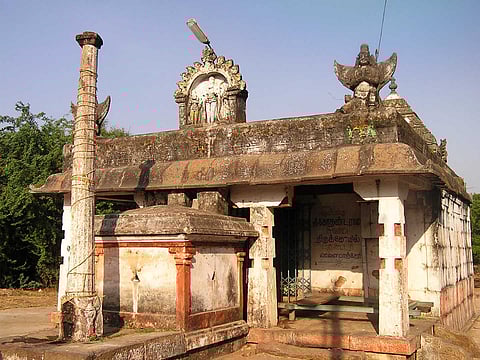 ஆலயத்திற்கும் வெளியில் உள்ள கருடர் சன்னிதிக்கும் நடுவில் ஓர் நான்கு கால் மண்டபம் உள்ளது. இம்மண்டபத் தூண்களில் உள்ள சிற்பங்கள் அனைத்தும் வானிலை காரணமாக சேதமடைந்துள்ளன. கோயிலின் வாயிலில் கல்லால் ஆன தீபஸ்தம்பம் ஒன்று உள்ளது. அதன் நான்கு புறங்களிலும் அனுமன், கருடன் மற்றும் வைணவக் குறியீடுகளான சங்கும் சக்கரமும் காணப்படுகின்றன.