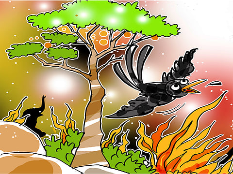 "நான் என்னோட அலகுல ஏரித் தண்ணிய கொண்டு வந்து ஊத்தி, நெருப்பை அணைக்கப் பார்க்கிறேன்."