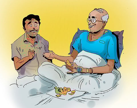 அவசர சிகிச்சைப் பிரிவில் அனுமதித்திருப்பார்கள். செயற்கை சுவாசத்தில் மூச்சுத் திணறிக் கொண்டிருப்பார் என்றெல்லாம் பிரம்மாண்டக் கற்பனைகளுடன் பதறியடித்துக் கொண்டு போனால் ஆசாமி படுக்கையில் உட்கார்ந்துகொண்டு சாத்துக்குடியை உறித்துக் கொண்டிருந்தார்.