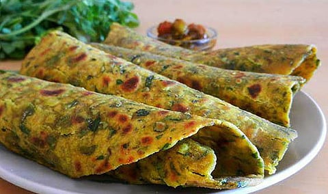 வெந்தயக்கீரை யின் இலைகள் மட்டுமே எடுத்து நன்கு கழுவி பொடியாக நறுக்கவும்.அதனுடன் கோதுமை மாவு, மிளகாய்த்தூள்.மஞ்சள் தூள்.தயிர் வெண்ணெய்.உப்பு சேர்த்து பிசைந்து சிறிது தண்ணீர் சேர்த்து பிசைந்து கொள்ளவும்.கீரை தண்ணீர் விடும் தன்மை உடையது.அதனால் கவனமாக பிசைந்து வைக்கவும்.. பிறகு மாவை சிறு சிறு உருண்டைகளாக செய்து சப்பாத்தியாக இட்டு சுற்றிலும் மடித்து மறுபடியும் சற்று கனமாக இட்டு தோசை கல்லில் போட்டு பதமாக போட்டு எடுக்கவும்.