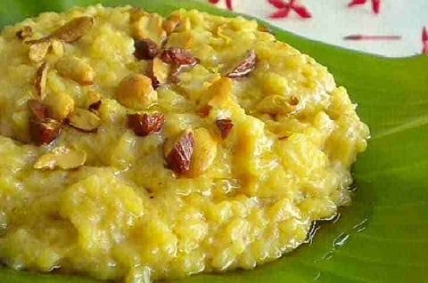 அடுப்பில் வாணலியை போட்டு பச்சரிசியை , சிவக்க வறுத்துக் கொள்ளவும். 2 டம்ளர் பால் விட்டு குக்கரில் நன்கு வேகவிடவும். நன்கு வெந்ததும் வெல்லத்தை பாகு வைத்து வடிகட்டி ஒன்றாக கிளறி நெய்யில் முந்திரி பருப்பை வறுத்து போடவும் . ஏலக்காய் பொடியை தூவி இறக்கவும்.