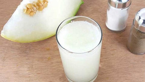 பூசணிக்காயை தோல் சீவி நடுவில் உள்ள விதை பகுதியை வெட்டி எடுத்து விட்டு சிறிய துண்டுகளாக வெட்டி மிக்ஸி ஜாரில் போட்டு அத்துடன் உப்பு கருவேப்பிலை போட்டு தண்ணீர் ஊற்றி நன்கு அடித்து எடுத்து சல்லடையில் அரித்து கண்ணாடி கிளஸில் ஊற்றி தேன் அல்லது நாட்டு சக்கரை போட்டு ஸ்பூன் வைத்து நன்கு கலந்து குடிக்கவும். அடிக்கிற வெயிலுக்கு உடலுக்கு இதமாக இருக்கும்.