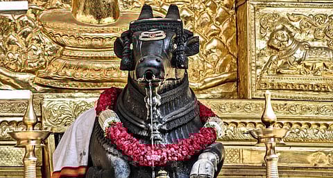 கர்நாடக மாநிலம், பெங்களூருவில் உள்ள மல்லேஸ்வரம் பகுதியில் அமைந்துள்ளது ஸ்ரீ தக்ஷிண முகநந்தி தீர்த்த கல்யாணி திருக்கோயில். இந்தக் கோயிலின் சிறப்பே இங்குள்ள நந்தியின் வாயில் இருந்து எப்போதும் நீர் ஊற்றாக ஊறி கொட்டிக் கொண்டிருப்பதுதான். அனைத்துச் சிவாலயங்களிலும் சிவபெருமானுக்கு எதிராகத்தான் நந்தி அமைக்கப்பட்டிருப்பார். ஆனால், இந்த ஸ்ரீ தக்ஷண முகம் நந்தி தீர்த்த கல்யாணி திருக்கோயிலில் நந்தி பகவான் சிவலிங்கத்துக்கு மேல் உள்ள தளத்தில் உள்ளார். அதோடு, அந்த நந்தியிலிருந்து வடியும் தீர்த்தம் சிவலிங்கத்தின் தலையில் விழும் வகையில் அமைக்கப்பட்டுள்ளது. சிவனை அபிஷேகம் செய்வது போன்று அந்த தீர்த்தம் பின்னர் அந்த நீர் அங்குள்ள தெப்பக்குளத்தில் சென்றடையும் வகையில் அமைக்கப்பட்டுள்ளது.