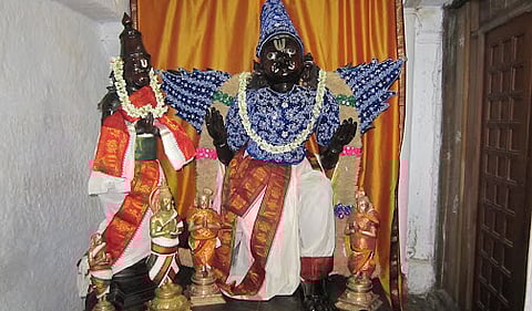 அந்த கருடாழ்வாருக்கு பக்கத்திலேயே அதே சன்னிதியில், ‘சிறிய திருவடி’ என்று அழைக்கப்படும் ஹனுமனும் இருக்கிறார். பெரிய திருவடியான கருடாழ்வாரையும் சிறிய திருவடியான ஹனுமனையும் ஒரே இடத்தில் தரிசித்ததே ஆச்சரியமாக இருக்க, உத்ஸவ கருடாழ்வார் தம் இரு மனைவியரோடு கல்யாண கருடராக அருள்பாலித்தபடி மெய்சிலிர்க்க வைத்தார். ருத்ரா, சுகீர்த்தி என்பவர்கள் கருடாழ்வாரின் மனைவியர். அப்படி இரு மனைவியரோடு இருக்கும் கருடாழ்வாரை ஸ்வாமி ஸ்ரீ தேசிகன் கூட தமது கருட தண்டகம் எனும் ஸ்தோத்திரத்தில், ‘கதி ப்ரீத ருத்ரா ஸுகீர்த்தி’ என்று அருளி இருக்கிறார். கருடாழ்வாருக்கென்று கல்யாண உத்ஸவம் ப்ரத்யேகமாக நடைபெறுவதும் இத்திருக்கோயில் மட்டும்தான் என்பதே இக்கோயிலின் தனி சிறப்பு. உயர்ந்த ரக சந்தன எண்ணெயை மட்டுமே இக்கோயில் மூலவர் கருட பகவானுக்கு பூசுகிறார்கள். மற்றபடி தனியாக மூலவருக்கு அபிஷேகம் என்பது இங்கே கிடையாது.
