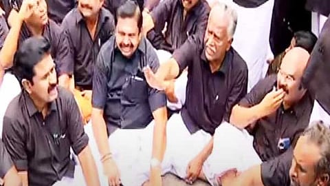 இதனால், தடையை மீறி அதிமுகவினர் இன்று போராட்டத்தில் ஈடுபட்டனர். அதிமுக இடைக்கால பொதுச்செயலர் எடப்பாடி பழனிசாமி, துணைப் பொதுச் செயலாளர் கே.பி.முனுசாமி, முன்னாள் அமைச்சர்கள் ஜெயக்குமார், செங்கோட்டையன், ஆர்.பி.உதயகுமார், வளர்மதி, கே.சி.கருப்பண்ணன் உள்ளிட்ட அதிமுகவினர் கறுப்பு சட்டை அணிந்து வந்து தரையில் அமர்ந்து போராட்டத்தில் ஈடுபட்டனர்.