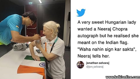 அதன் பிறகு அந்த நபரின் டீ சர்ட்டில் நீரஜ் சோப்ரா ஆட்டோகிராப் மோட்டார். இவரின் இந்த செயலை பலரும் கொண்டாடி வருகின்றனர். விளையாட்டு மட்டுமின்றி தன் தாய் நாட்டு தேசியக் கொடியை மதிப்பதிலும் நீரஜ் சோப்ரா சிறந்தவர் என பலரும் பாராட்டி வருகின்றனர். அத்துடன் மூவர்ணக் கொடி அருகில் இருக்க தன் பெண் ரசிகையின் டீசர்டில் அவர் ஆட்டோகிராப் போடும் புகைப்படமும் இணையத்தில் ட்ரெண்டாகி வருகிறது.