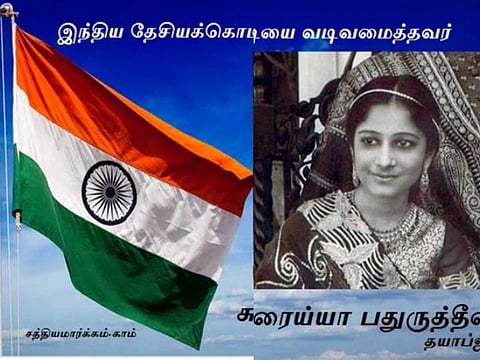 அதன்படி நமது தேசிய மூவர்ண கொடியையும் அதன் மத்தியில் அசோக சக்கரத்தையும் வடிவமைத்தவர்கள் பக்ருதீன் தியாப்ஜி மற்றும் அவர் மனைவி சுரைய்யா .
