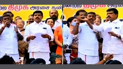 - என்று எடப்பாடி பழனிசாமியை விமர்சிப்பது போல சென்னை மத்திய மாவட்ட பாஜக தலைவர் பேசத்தொடங்கவே படக்கென அவரிடம் இருந்து மைக்கைப் பிடிங்கி அவரது பேச்சை ஸ்விட்ச் ஆஃப் செய்தார் பாஜக மாநில துணைத்தலைவரான கரு.நாகராஜ்.