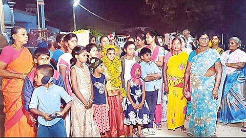 அதில் நீண்ட நேரம் தூங்காமல் இருந்த, அந்த கிராமத்தைச் சேர்ந்த, கார்த்திகேயன் மேகலா தம்பதியின் மகளான, திண்டுக்கல்லில் தனியார் பள்ளியில் ஐந்தாம் வகுப்பு படித்து வரும் சர்வஅதிர்ஷ்டா என்ற சிறுமி நிலா பெண்ணாக தேர்வு செய்யப்பட்டார். நிலா பெண்ணாக தேர்வு செய்யப்பட்ட சிறுமி சர்வஅதிஷ்டாவை கிராமத்துப் பெண்கள் ஊர் எல்லையில் உள்ள சரளி மலைக்கு அழைத்துச் சென்றனர். அங்கு சிறுமையை அமர வைத்து பறித்துவந்த ஆவாரம் பூக்களை மாலையாக தொடுத்து நிலா பெண்ணான சிறுமிக்கு அணிவித்ததுடன் அந்தப் பூக்களாலாலேயே அவருடைய தலை கைகளை சுற்றி அழகாக ஆபரணங்கள் போல் அலங்கரித்தனர்.