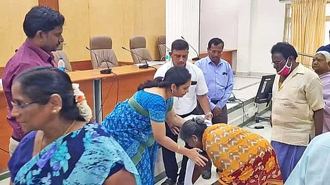 மூதாட்டிகள் மாவட்ட ஆட்சியரின் காலில் விழ முயன்ற சம்பவம் கூட்டரங்கில் சற்று பரபரப்பை ஏற்படுத்தியது.