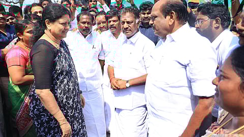 தமிழ்நாட்டின் முன்னாள் முதலமைச்சர் அண்ணாதுரையின் 55வது நினைவு நாளான இன்று, அவரின் நினைவிடத்தில் பல்வேறு அரசியல் கட்சி பிரமுகர்கள் மரியாதை செலுத்தினர். இந்த சூழலில் முன்னாள் முதலமைச்சர் ஓ.பன்னீர்செல்வமும்-ஜெயலலிதாவின் தோழி வி.கே. சசிகலாவும் அடுத்தடுத்து அஞ்சலி செலுத்த வந்திருந்தபோது முதல் முறையாக பொதுவெளியில் நேரில் சந்தித்துக்கொண்டனர்.