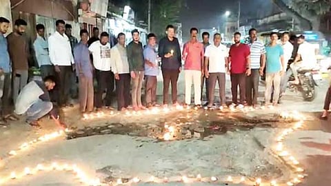 இந்நிலையில் மைசூரு மாநகராட்சி இந்த சாலை பள்ளங்களை சரிசெய்து மூடாததை கண்டித்து, மைசூரு கிருஷ்ணராஜா இளைஞர் சங்கத்தினர் நூதன போராட்டத்தில் ஈடுபட்டனர். சாலையில் உள்ள பள்ளங்களைச் சுற்றிலும் அகல விளக்குகள் தீபம் ஏற்றிவைத்து சாலைமறியல் செய்தனர். இதுகுறித்து அவர்கள் தெரிவித்ததாவது;