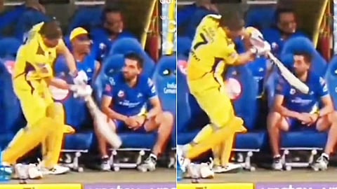 பொதுவாக எம்.எஸ். தோனி கடைசி நேரத்தில், இக்கட்டான சூழ்நிலையில் அடித்து ஆடும் நோக்கத்தில்தான் களமிறங்குவார். அந்தவகையில், களத்திற்கு வரும் முன்னர் சிறிது warm up செய்வது வழக்கம். அப்படி தோனி ரிலாக்ஸாக பந்தை சிக்ஸருககு அடிப்பதுபோல் பேட்டை தூக்கிஅடிக்க, அருகே தீபக் சாஹர் அமர்ந்திருக்க, அவரது முகம் அருகே பேட் வரவே, பயந்துபோய் அநத் இடத்தை விட்டு உடனே எழுந்துவிடுகிறார். ஆனால் தோனி இதை கண்டுகொள்ளாததுபோல் இருப்பார்.
