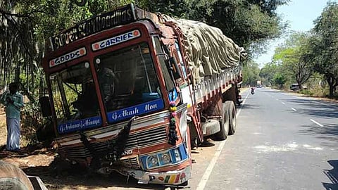 எதிரே வந்த மற்றொரு லாரி டிப்பர் மீது மோதியதில், இரு லாரிகளும் கவிழ்ந்தன. இரு டிரைவர்களும் படுகாயம் அடைந்தனர்.