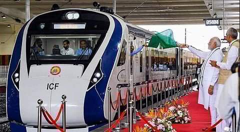 வந்தே பாரத் என்ற அதிநவீன விரைவு சொகுசு ரயில் நாட்டின் முக்கிய வழித் தடங்களில் இயக்கப்பட்டு வரப்படுகிறது. ஏற்கெனவே தமிழகத்தில் சென்னை - மைசூரு இடையே வந்தே பாரத் ரயில் இயக்கப்பட்டு வரப்படுகிறது. இந்நிலையில், சென்னை - கோவை இடையே புதிதாக வந்தே பாரத் ரயில் சேவையை பிரதமர் நரேந்திர மோடி இன்று சென்னையில் தொடங்கி வைக்கிறார். வழக்கமான ரயில் சேவை நாளை 9ம் தேதி முதல் தொடங்கவிருக்கிறது.