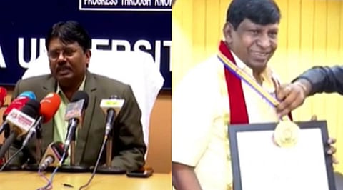 நடிகர் வடிவேலு, இசையமைப்பாளர் தேவா உள்ளிட்டோருக்கு சமீபத்தில் கௌரவ டாக்டர் பட்டம் வழங்கப்பட்ட நிலையில், இவை போலியானது என்றும் இந்த கௌரவ டாக்டர் பட்டத்திற்கும் தங்களுக்கும் எந்தவித தொடர்பும் இல்லை என்றும் அண்ணா பல்கலைக்கழகத்தின் துணை வேந்தர் வேல்ராஜ் தெரிவித்துள்ளார்.