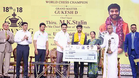 மேலும் விழாவில் முதல்வர் பேசுகையில், உலகின் இளைய செஸ் சாம்பியனாக மாற வேண்டும் என்ற தன்னுடைய கனவை, தன்னுடைய திறமையாலும், உழைப்பாலும் நனவாக்கியிருக்கிறார் குகேஷ். இதற்கு பின்னால் குகேஷ்க்கு இருக்கும் கடின உழைப்பு, விடாமுயற்சி, தன்னம்பிக்கை, இலக்கை நோக்கிய பயணம் இவையெல்லாவற்றையும் இளைஞர்கள் எல்லோரும் உத்வேகமாக எடுத்துக்கொள்ள வேண்டும் என்று கூறினார்.