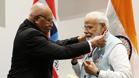பப்புவா நியூ கினியாவில் இன்று நடைபெறும் இந்திய-பசிபிக் தீவுகள் ஒத்துழைப்புக்கான மன்றத்தின் மூன்றாவது உச்சி மாநாட்டில் பிரதமர் மோடி கலந்து கொண்டார். அப்போது பிஜி நாட்டின் பிரதமரான சிடிவேனி ரபுகா இந்திய பிரதமர் நரேந்திர மோடிக்கு இந்த “பிஜி நாட்டின் உயரிய விருதினை” வழங்கி கௌரவித்தார்.