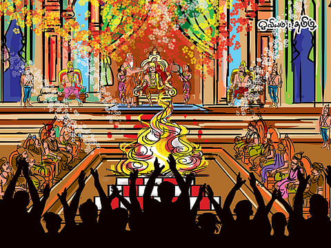 கேட்பதற்கு இனிமையாக மங்கள இசை ஒலித்துக் கொண்டிருக்கிறது. அது மற்றவர்கள் பேசும் தேவையற்ற சொற்களை முழுகடிக்கிறது. வேதங்கள் ஓதப்படுகின்றன. தேவார, திருவாசகப் பாடல்கள் பாடப்படுகின்றன. இறைவனடிமைகள் தங்கள் ஆடலால் அனைவரையும் மகிழ்வித்துக்கொண்டிருக்கின்றனர். ஊரே மகிழ்ச்சிக் கடலில் நீந்திக் களிக்கிறது.