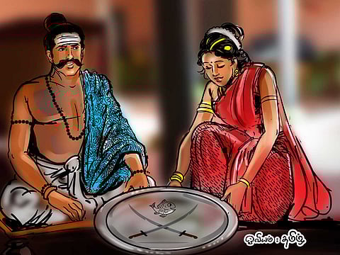 "நங்கை, உன் தந்தையார் வருகிறார். உன் அக்காவை இரண்டு மூன்று இலைகள் கூடப் போடச்சொல்லு" என்று உள்பக்கம் திரும்பிச் சொன்ன சிவாச்சாரி, வாசலை நோக்கி விரைகிறான்.