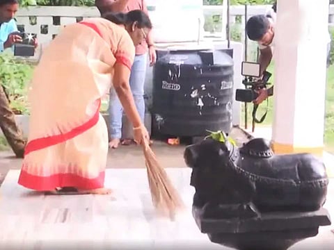 பாஜக தலைமையிலான தேசிய ஜனநாயகக் கூட்டணியின் ஜனாதிபதி வேட்பாளராக அறிவிக்கப்பட்ட திரெளபதி முர்மு, இன்று ஒடிஷாவிலுள்ள தன் சொந்த ஊர் சிவன் கோயிலுக்குச் சென்று தரையை சுத்தம் செய்து வழிபட்டது பெரும் பரபரப்பை ஏற்படுத்தியுள்ளது.
