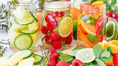 2. தர்பூசணி மற்றும் துளசி இலை: ஒரு லிட்டர் தண்ணீரில் இரண்டு கப் தர்பூசணி மற்றும் கை நிறைய துளசி இலைகளை சேர்த்து ஊற வைத்துக் குடிக்கலாம். தர்பூசணியில் ஆல்கலைன் மினரலான பொட்டாசியம் மற்றும் ஆன்டி ஆக்ஸிடென்ட் Lycopene உள்ளது. இது செல்களைப் பாதுகாக்க உதவுகிறது. மேலும், துளசி இலை ஸ்ட்ரெஸ்ஸை குறைத்து உடலுக்கு அமைதியைக் கொடுக்கும்.