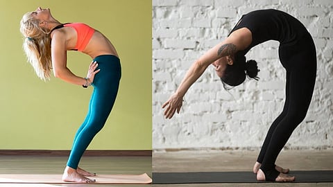 இப்போது உங்கள் முதுகை பின்னால் வளைத்து அதாவது உங்கள் முதுகெலும்பை பின்னோக்கி நீட்ட வேண்டும். கால் முட்டிகளை மடக்கக்கூடாது. உங்களால் எவ்வளவு முதுகை பின்னால் வளைக்க முடியுமோ அவ்வளவு வளைக்கலாம். இந்த ஆசனத்தை ஆரம்பத்தில் செய்பவர்கள் பேலன்ஸ் செய்ய கைகளை இடுப்பில் வைத்து கொண்டு செய்யலாம். இந்த ஆசனத்தை செய்யும் போது கவனமாக செய்ய வேண்டும் இல்லையெனில் விழுந்து விடும் அபாயம் உள்ளது.
