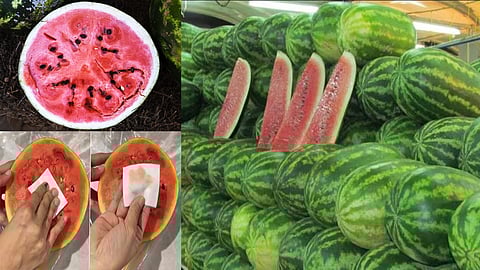 * தர்பூசணியை வெட்டிய பிறகு, அதன் நடுவில் துளைகள் மற்றும் விரிசல்களைக் கண்டால், இது தர்பூசணி ஊசி போடப்பட்டதற்கான அறிகுறியாகவும் இருக்கலாம். இயற்கையாகவே பழுத்த பழத்தில் அத்தகைய பள்ளம் அல்லது விரிசல் இருக்காது.