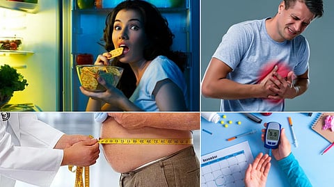 இரவு நேரம் கடந்து சாப்பிடுவதால் உடலில் கொழுப்புகள் அதிகரிப்பது மட்டுமில்லாமல் ரத்தத்தில் LDL, triglycerides போன்ற கெட்டக் கொழுப்புகளும் அதிகரிக்கும். இதோடு ரத்தக்குழாயில் Inflammation அதிகரிக்கும். இந்த இடங்களில் கெட்டக் கொழுப்புகள் படிந்து அடைப்புகளை உண்டாக்கும். இதனால் மாரடைப்பு போன்ற அபாயகரமான பிரச்னைகள் உண்டாகும்.