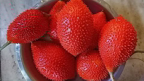 பழங்கள் முட்டை வடிவில் அல்லது நீள் வட்ட வடிவில் இருக்கும். தோலில் பல சிறிய முட்கள் காணப்படும். இவை ஆரம்பத்தில் பச்சை நிறத்திலும் பழுத்து முதிர்ச்சி அடையும் போது ஆழமான ஆரஞ்சு சிவப்பு நிறத்திலும் காணப்படும். பழங்கள், விதைகள் மற்றும் விதை எண்ணையில் பீட்டா கரோட்டின் மற்றும் லைகோபீன், ஒமேகா 6, ஒமேகா 3 போன்ற கொழுப்பு அமிலங்களும் நிறைந்துள்ளது.