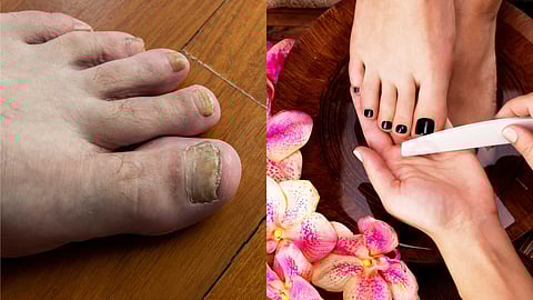 6. பூஞ்சை தொற்று: கால் நகங்களில் பொதுவாக தோன்றும் பூஞ்சை தொற்று நகங்களை தடிமனாக்கும், வளைக்கும். மங்கலான நிறம் அல்லது கருப்பு போன்ற நிறத்தில் காணப்படும்.